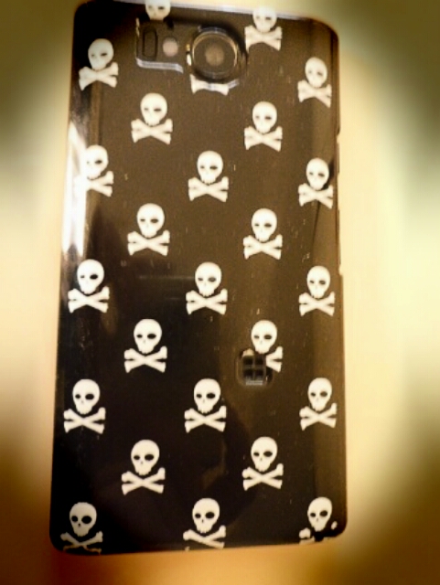 黒いカバーで白いドクロマークがついています本体はおそらく濃い紫です」